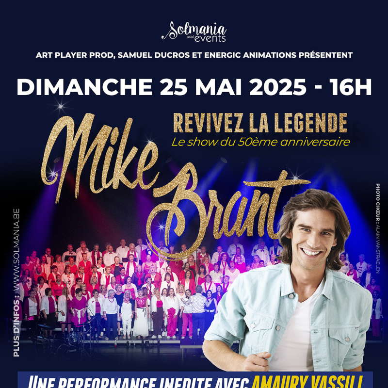 HOMMAGE A MIKE BRANT, 50ème anniversaire, la légende, avec Amaury Vassili, ses musiciens & les 200 choristes !MIKE BRANT, cet artiste unique, véritable symbole de la chanson d’amour, est devenu éternel il y a déjà cinquante ans. Amaury Vassili, ce ténor à la voix puissante, honore sur scène et depuis ses débuts, la mémoire de ce grand interprète.