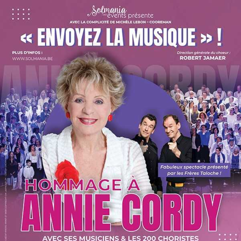 « ENVOYEZ LA MUSIQUE »Tel est le titre du spectacle présenté par l’asbl Solmania Events pour janvier 2025. Un vibrant hommage sera rendu à Annie Cordy, pour saluer la mémoire de cette grande dame de chez nous.Un spectacle exceptionnel avec ses musiciens, (les Cordystes), les 200 choristes et des artistes de marque : Sandra KIM – NICOLETTA – Michèle TORR - DAVE - Julie CARPINO (The Voice 2014) – TILIANO (The Voice Kids) – MARKA- Laurence BIBOT – LES TCHOUPIES … le tout présenté par les Frères Taloches.Un spectacle hors du commun qui s’annonce grandiose et un magnifique cadeau à offrir pour les fêtes. Chaque artiste invité interprétera une chanson d’Annie Cordy seul et une autre accompagné des 200 choristes, sans oublié le final. En avant toute, / ambiance avec « la bonne du curé », Frida oumpapa, Tata yoyo… Annie Cordy était une vraie artiste, sa voix nous touchait tous et nous touchera toujours grâce aux chansons qu’elle nous a laissées. Nos 200 choristes viennent de toute la Wallonie, de Bruxelles et du nord de la France. Au de-là de la passion du chant qui les réunit, ils vivent des moments précieux d’amitié, de joie et de complicité. Un beau projet intergénérationnel ! Venez partager ces bons moments, vibrer au rythme des chansons d’Annie, vous replonger quelques années en arrière… et vous serez enchantés.Concert
