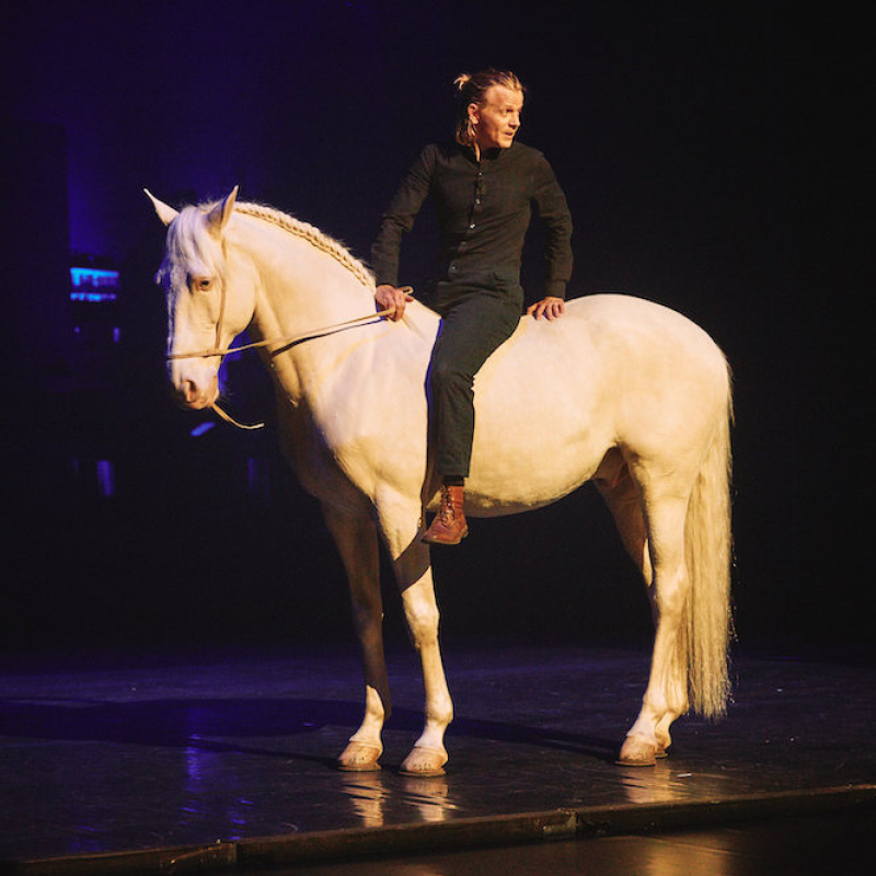 Drôle, tendre, émouvant. Drôle, ironique et déroutant. Alex Lutz n’est pas seulement un humoriste au texte soigné, fuyant la vanne facile et l’interactivité avec le public. Il est aussi un mime (impayable chef d’orchestre sans bras), un imitateur (irrésistible homme-singe apprivoisant le cheval), un as de la métamorphose (désopilante paroissienne) et presque un chanteur (Michel Delpech revisité).